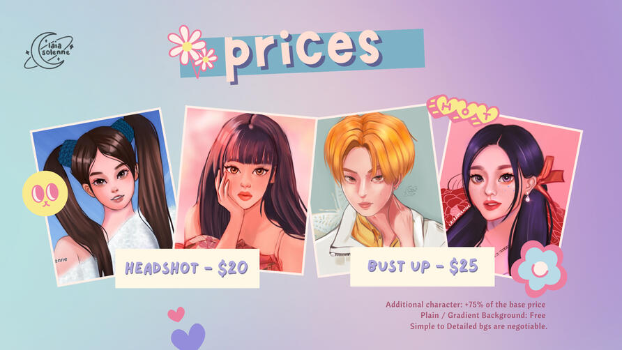 • Sketch and/or final sketches that the client must accept before I continue the work.• Insight and involvement in color plan.• Final commissioned artwork in 2048 x 2048 pixels at 300 dpi. The client may state otherwise.• Commissioned artwork in PNG format (transparent background AND plain/gradient background stated by the client).NOTE:I, laiasolenne, has the right to change my Terms of Service without prior warning. Please read my TOS each time you order to ensure that you have read the updated version.✓ By ordering a commission, you are confirming that you have read, understood, and agree to my Terms and Conditions.
