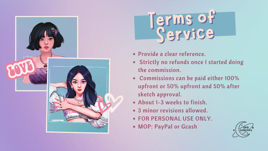• Currency accepted is either USD or PHP and can be paid through PayPal (international clients) or GCash (local clients). I am also accepting tips through Ko-fi.• Once payment is received and the invoice is already given, the client may no longer cancel their commission.• Commissions can be paid either 100% upfront or 50% upfront and 50% before receiving the finished artwork.